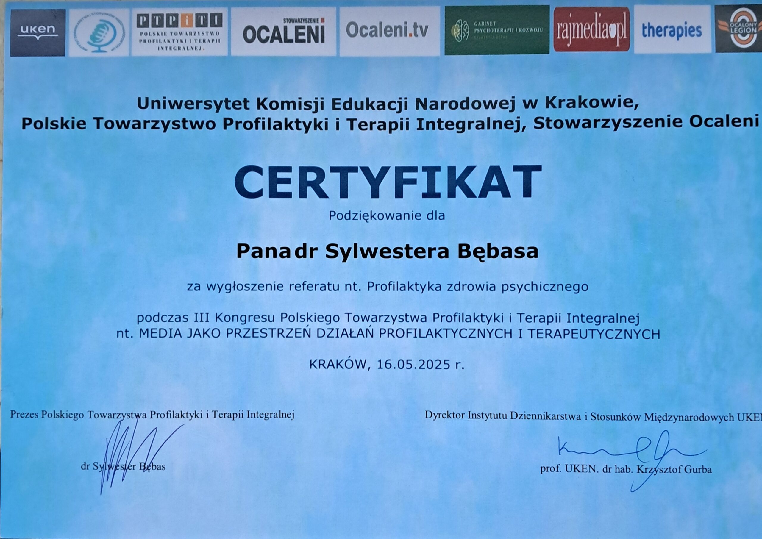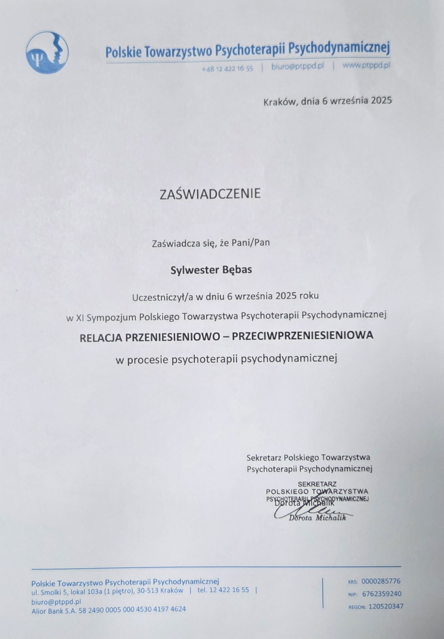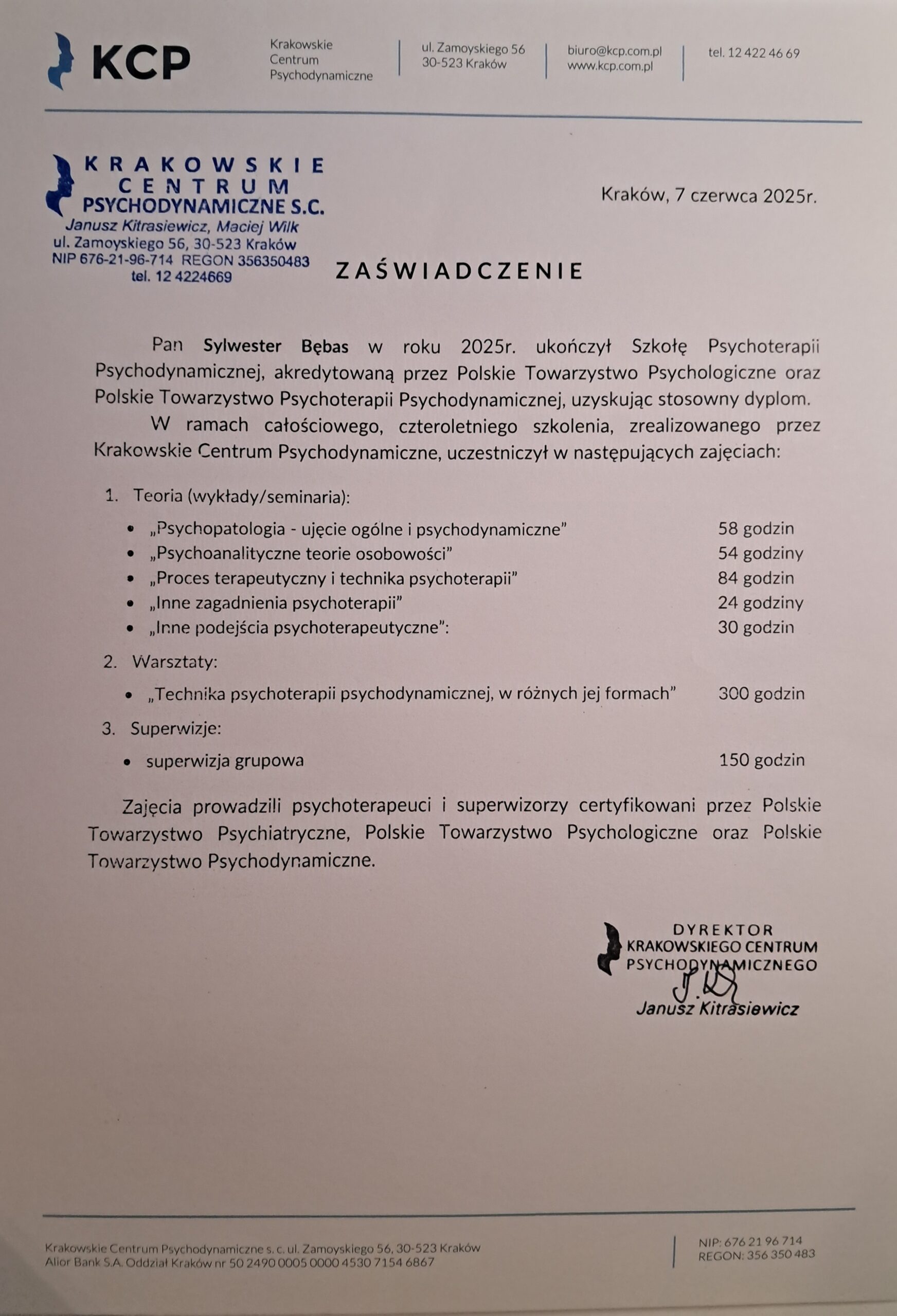 Sylwester Bębas – doktor nauk społecznych, nauczyciel akademicki, adiunkt w Uniwersytecie Komisji Edukacji Narodowej w Krakowie, dyplomowany psychoterapeuta psychodynamiczny, ukończył całościowe czteroletnie szkolenie z zakresu psychoterapii w Krakowskim Centrum Psychodynamicznym, trener rozwoju osobistego. Właściciel Gabinetu Psychoterapii i Rozwoju Sylwester Bębas w Kielcach. Specjalizuje się w prowadzeniu psychoterapii psychodynamicznej z wykorzystaniem podejścia TFP. Odbył staż kliniczny w Świętokrzyskim Centrum Psychiatrii w Morawicy w Centrum Zdrowia Psychicznego w Kielcach na Oddziale Psychiatrycznym Dziennym Ogólnym. Członek Polskiego Towarzystwa Psychoterapii Psychodynamicznej oraz Polskiego Towarzystwa TFP. Prezes Polskiego Towarzystwa Profilaktyki i Terapii Integralnej. Swoją pracę terapeutyczną poddaje stałej superwizji u certyfikowanych superwizorów TFP. Uczestnik oraz organizator specjalistycznych konferencji i warsztatów w obszarze psychoterapii. Do obszaru jego zainteresowań zawodowych należą: TFP (Transference-Focused Therapy – Psychoterapia Skoncentrowana na Przeniesieniu), leczenie zaburzeń osobowości, zaburzeń nastroju, zaburzeń lękowych oraz pomoc w przypadku przeżywania różnorodnych trudności indywidualnych w pracy, związkach i innych relacjach osobistych. W latach 2021-2024 ekspert w programie telewizyjnym Ocaleni TVP, autor audycji radiowych nt. rozwoju osobistego, uzależnień, psychoterapii. Autor i kierownik wielu programów badawczych, polskich i zagranicznych. Autor i współautor ponad stu prac naukowych w tym dwudziestu kilku książek, kilkunastu recenzji naukowych z zakresu psychoterapii, uzależnień, rozwoju osobistego.