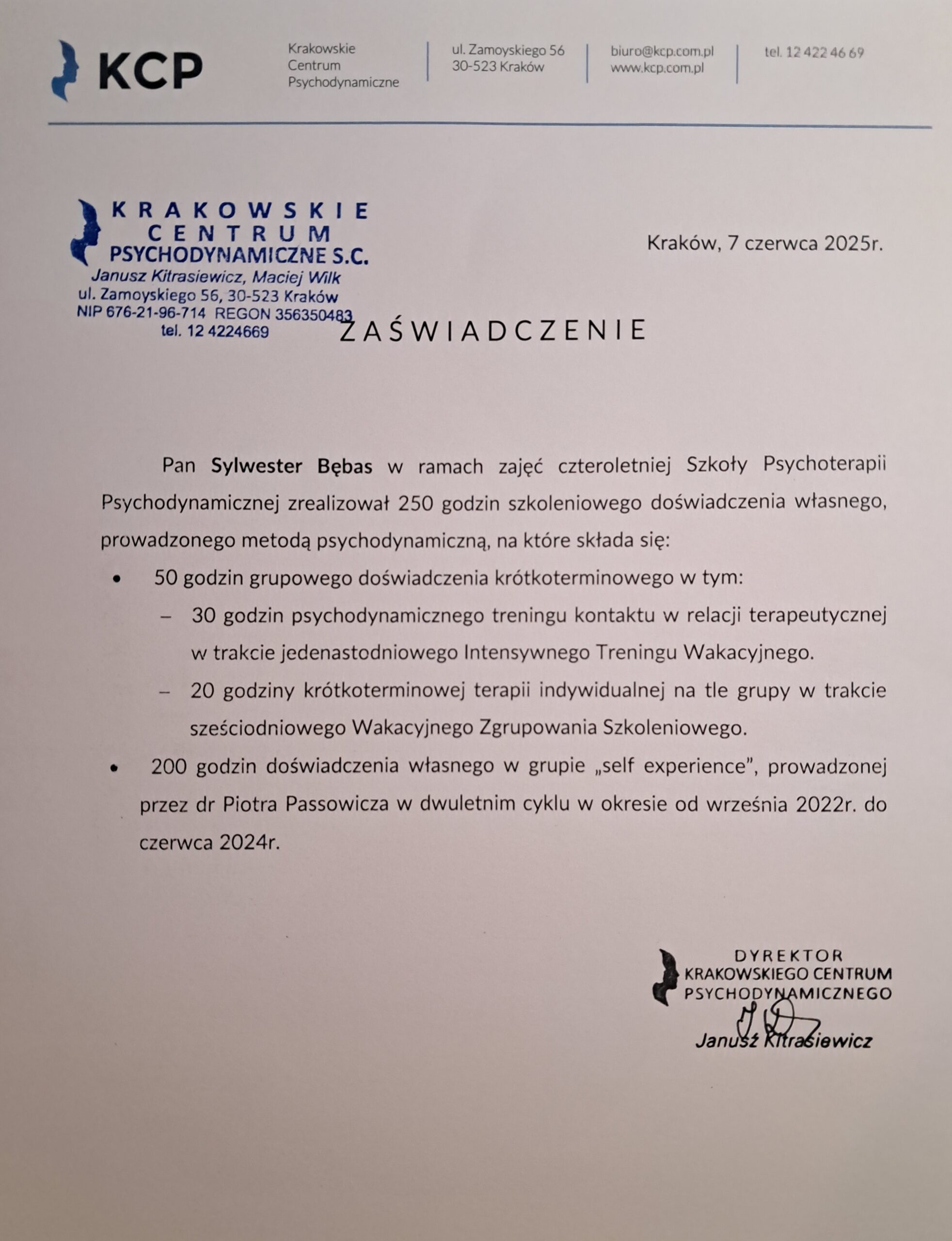 Gabinet Psychoterapii i Rozwoju Sylwester Bębas to idea kompleksowej pomocy dla osób w kryzysie psychicznym. Gabinet zlokalizowany jest pod adresem: Kwarciana 11C lok. 3U, Kielce, świętokrzyskie. Figurujemy w Centralnej Ewidencji i Informacji o Działalności Gospodarczej pod numerem: 6641885811. Zakłady Opieki Zdrowotnej to branża, w której działamy.